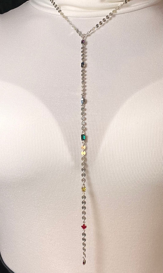 This sterling silver lariat showcases an array of Swarovski crystals, including amethyst, montana sapphire, aquamarine, emerald, topaz, siam ruby, and garnet. The design is inspired by the 7 chakras in the body, a symbol of balance and energy. The delicate stones and chain make this piece perfect for any occasion, serving as a reminder of the importance of honoring and respecting each energy center in the body.
